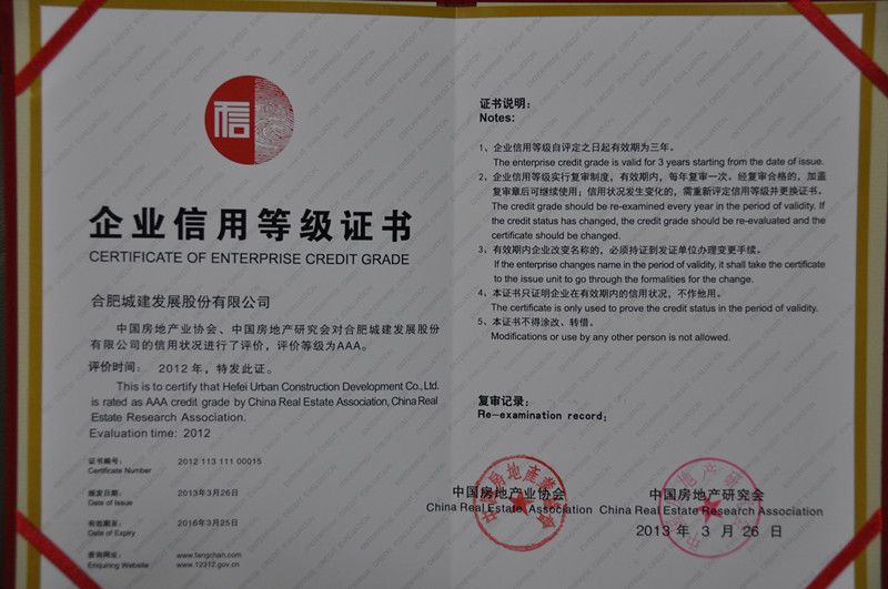 4月27日,中国房地产研究会、中国房地产业协会在山东潍坊召开会议,向全国48家房地产开发企业颁发行业信用评价匾牌和证书,做爱影片 发展股份有限公司首获AAA级信用评价等级证书,也是全省唯一获得AAA级证书的房地产开发企业。 经商务部信用工作办公室、国务院国资委行业协会联合办公室批准,中国房地产业协会、中国...